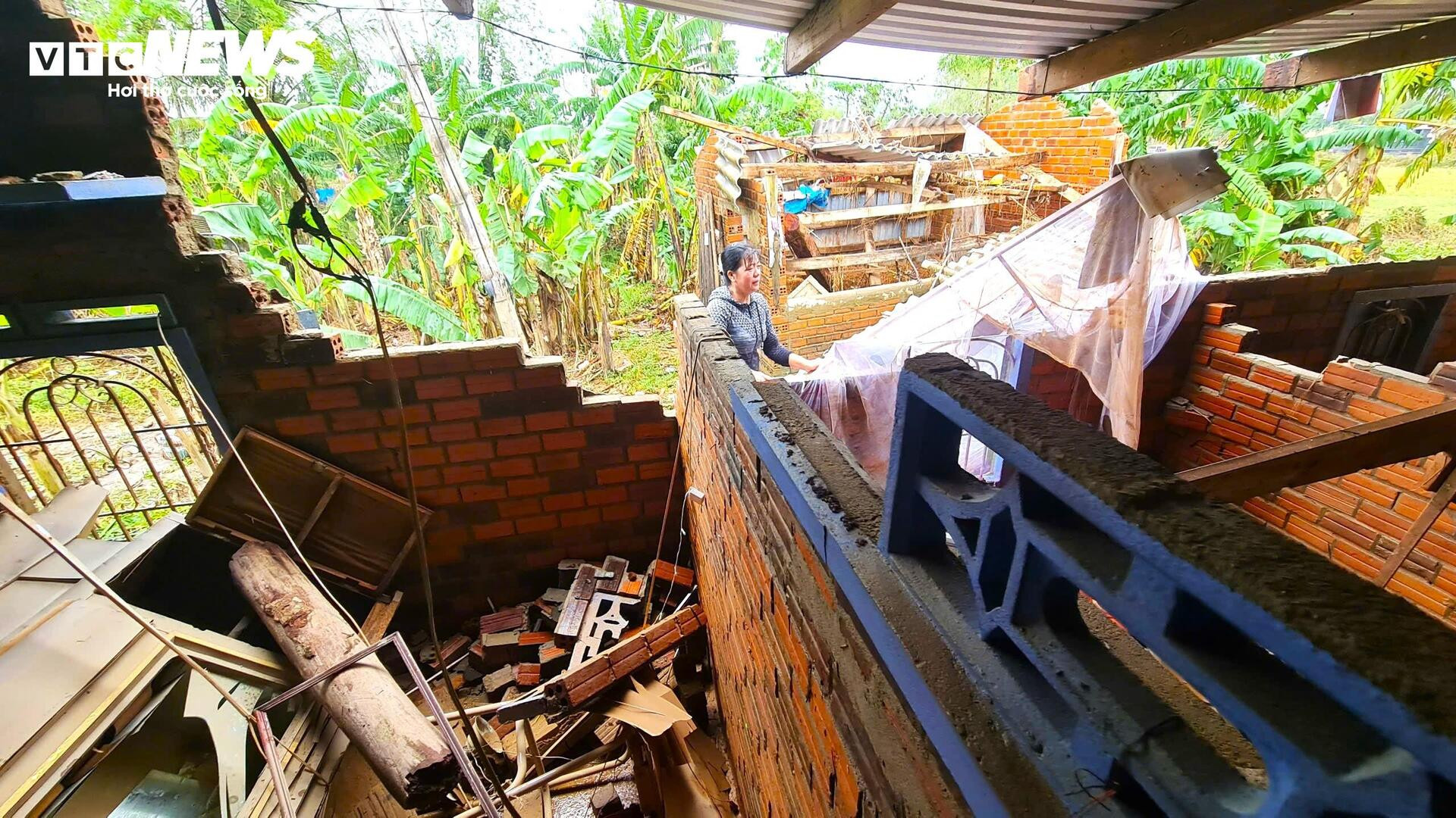 Bà Thu thẫn thờ vì nhà cửa tan hoang không còn nguyên vẹn.
