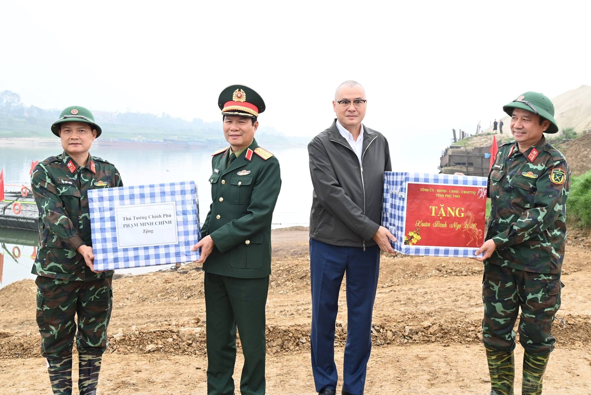 Các đại biểu dự lễ thông xe cầu phao Đoan Hùng và tặng quà, động viên các chiến sỹ thuộc đơn vị lắp, vận hành cầu phao Đoan Hùng.