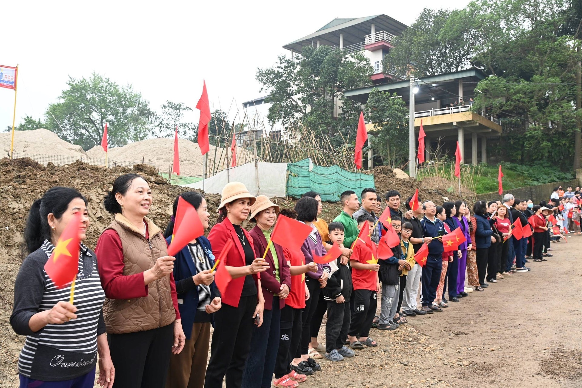 Người dân khu vực hai bên cầu Đoan Hùng đón đoàn đại biểu về dự lễ thông xe cầu phao Đoan Hùng.