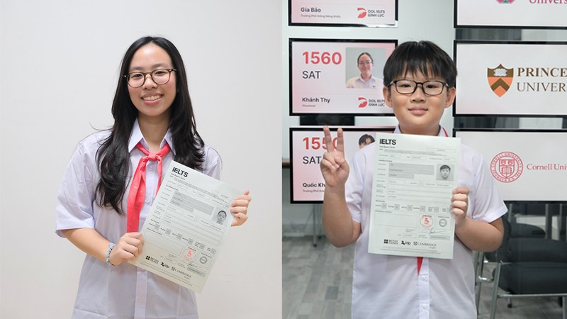 Từ phải qua: Trần Đình Hoàng Phúc, cậu bé giành 8.0 IELTS khi mới 10 tuổi; Nguyễn Ngọc Linh Đan, nữ sinh lớp 8 với thành tích 8.5 IELTS.