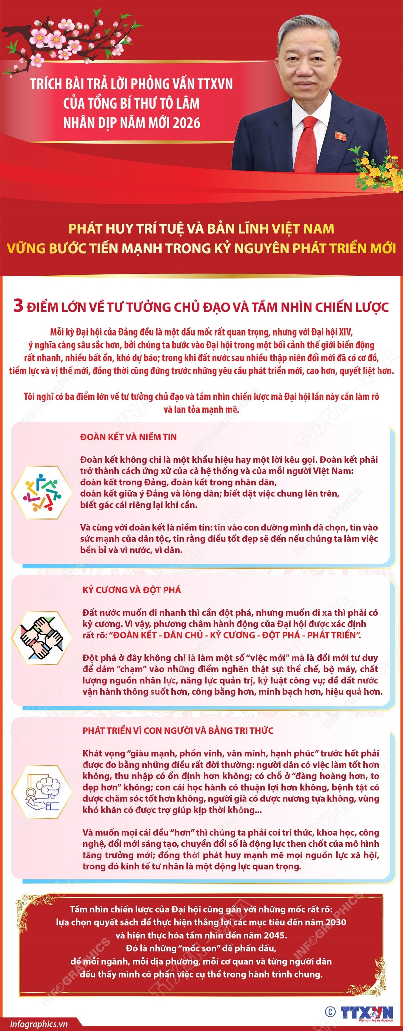 Trong bài trả lời phỏng vấn TTXVN Tết 2026, Tổng Bí thư Tô Lâm khẳng định những kết quả mà đất nước đạt được trong nhiệm kỳ vừa qua là kết tinh của sự lãnh đạo tài tình của Đảng, sự vào cuộc quyết liệt của cả hệ thống chính trị và trên hết là sự đồng lòng, quyết tâm, bản lĩnh và nghĩa tình của nhân dân ta trong những thời khắc thử thách nhất.