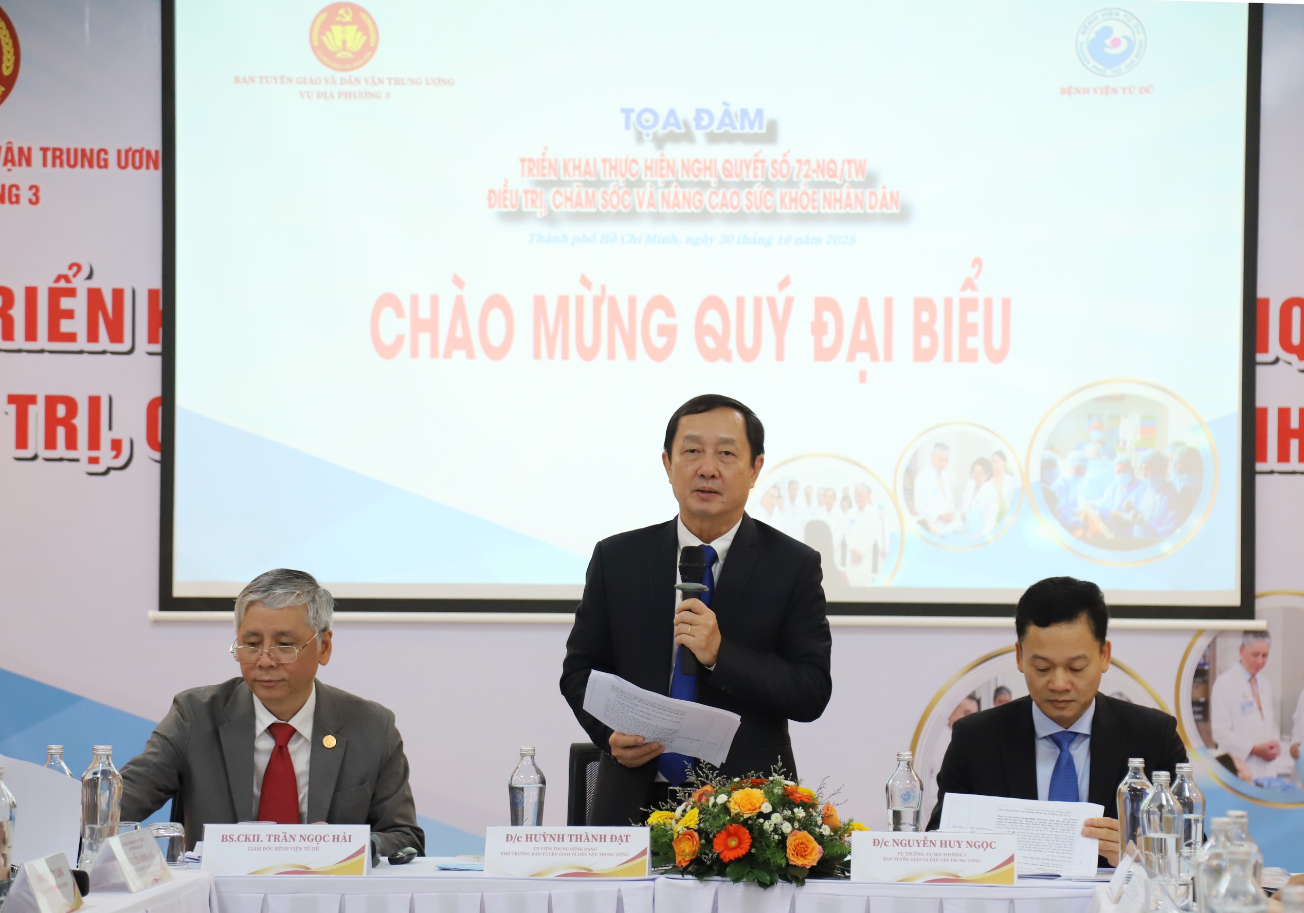 Phát biểu tại tọa đàm, ông Huỳnh Thành Đạt, Phó Ban Tuyên giáo và Dân vận Trung ương, nhấn mạnh Nghị quyết 72 không chỉ là định hướng chuyên môn mà còn là nhiệm vụ chính trị cấp bách, thể hiện sự quan tâm của Đảng và Nhà nước với sức khỏe nhân dân.
