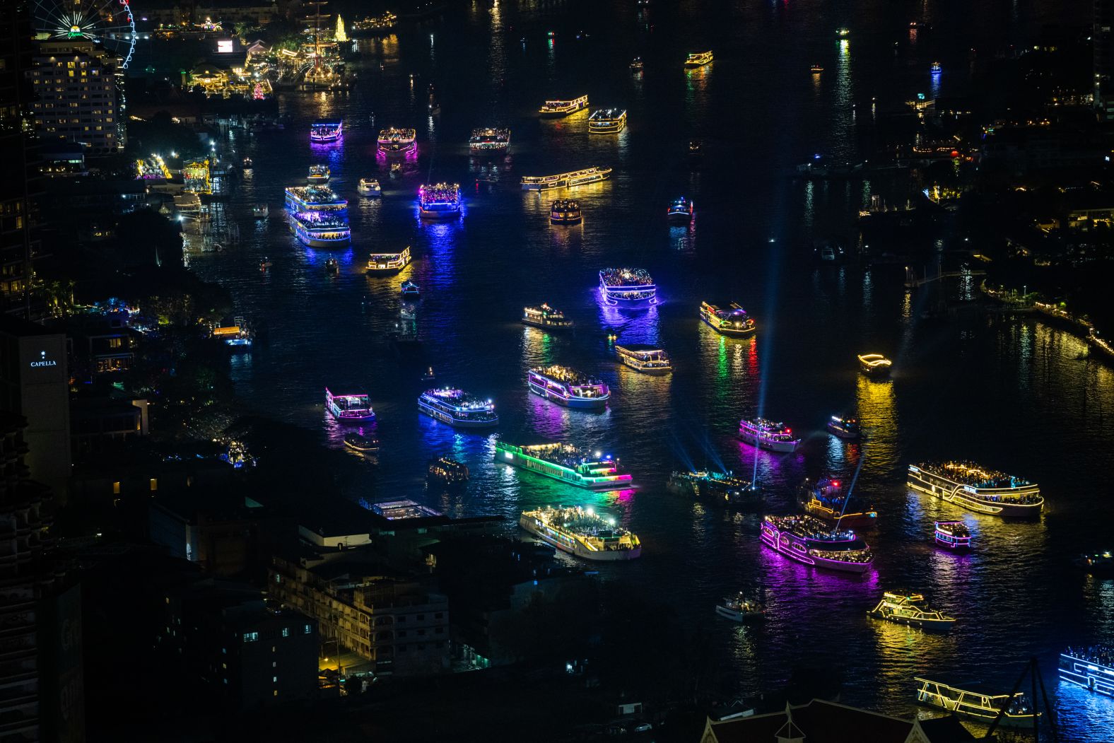 Tại Bangkok, Thái Lan thuyền du lịch xếp hàng trên sông Chao Phraya để xem màn trình diễn pháo hoa. Ảnh: Lauren DeCicca/Getty Images.