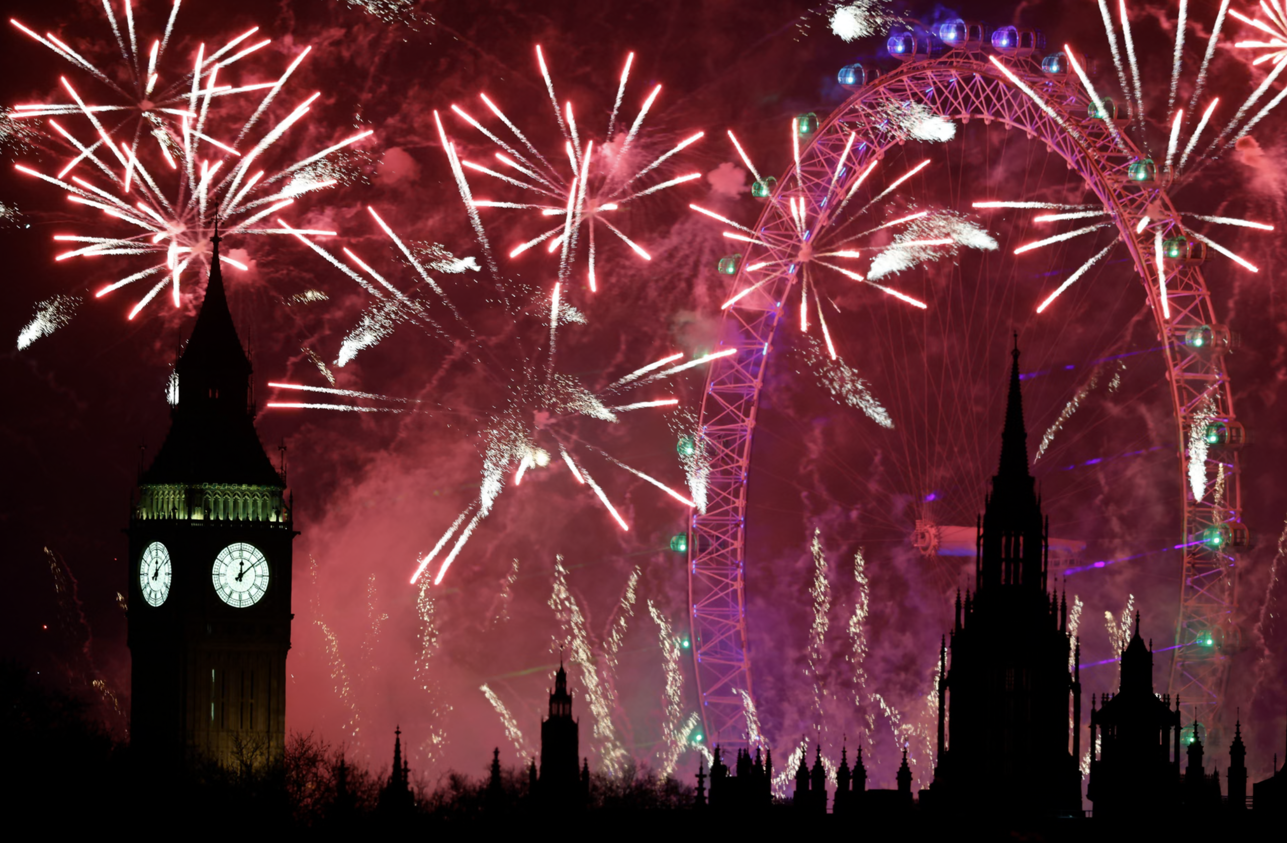 Tại London, Anh, màn pháo hoa đêm giao thừa rực sáng trên Tháp Elizabeth và Vòng quay London Eye trong lễ hội chào đón năm 2026. Ảnh: Tolga Akmen/EPA