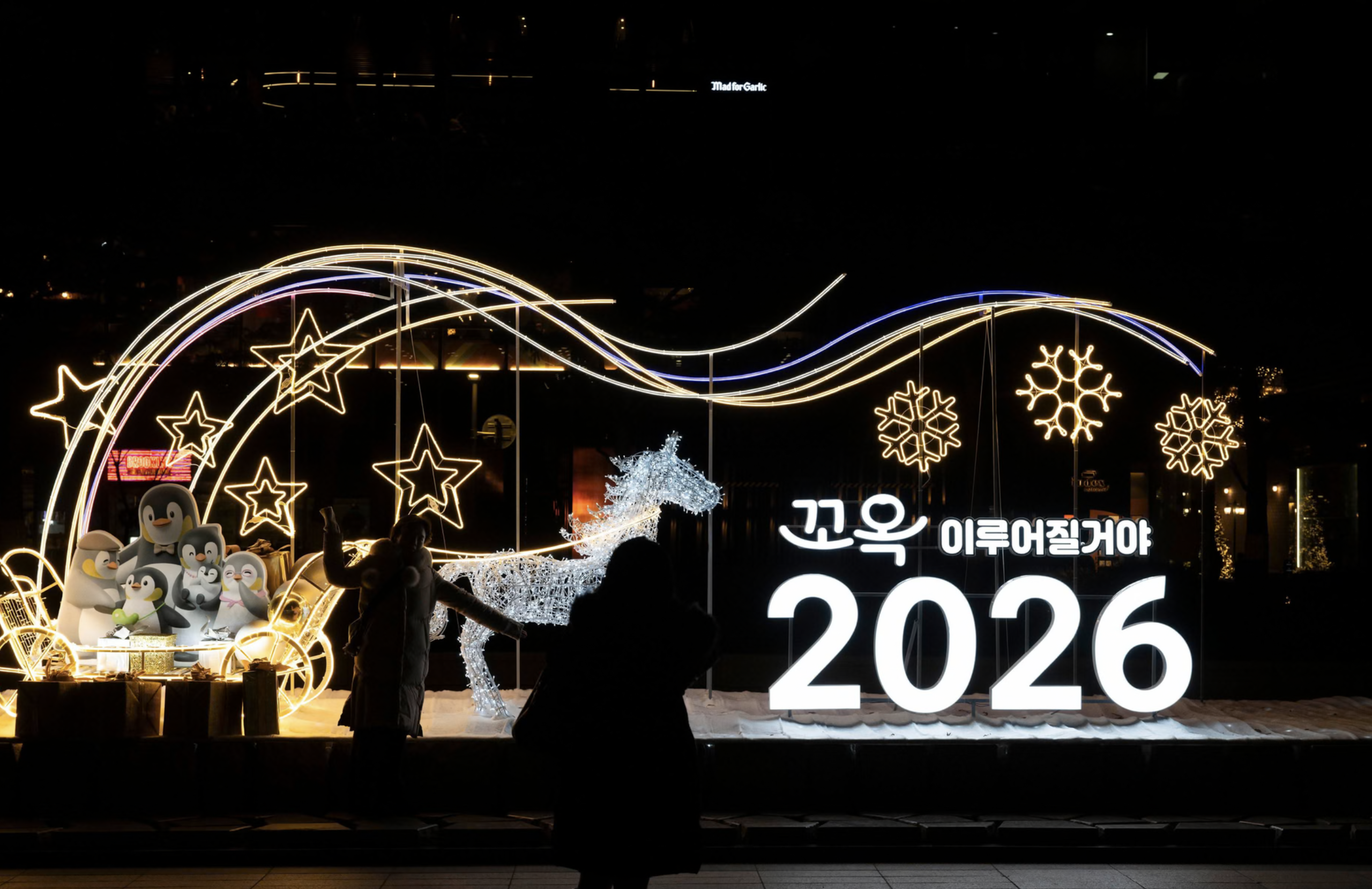 Đường phố Hàn Quốc trang hoàng lộng lẫy chào đón năm mới 2026. Ảnh: Guardian.