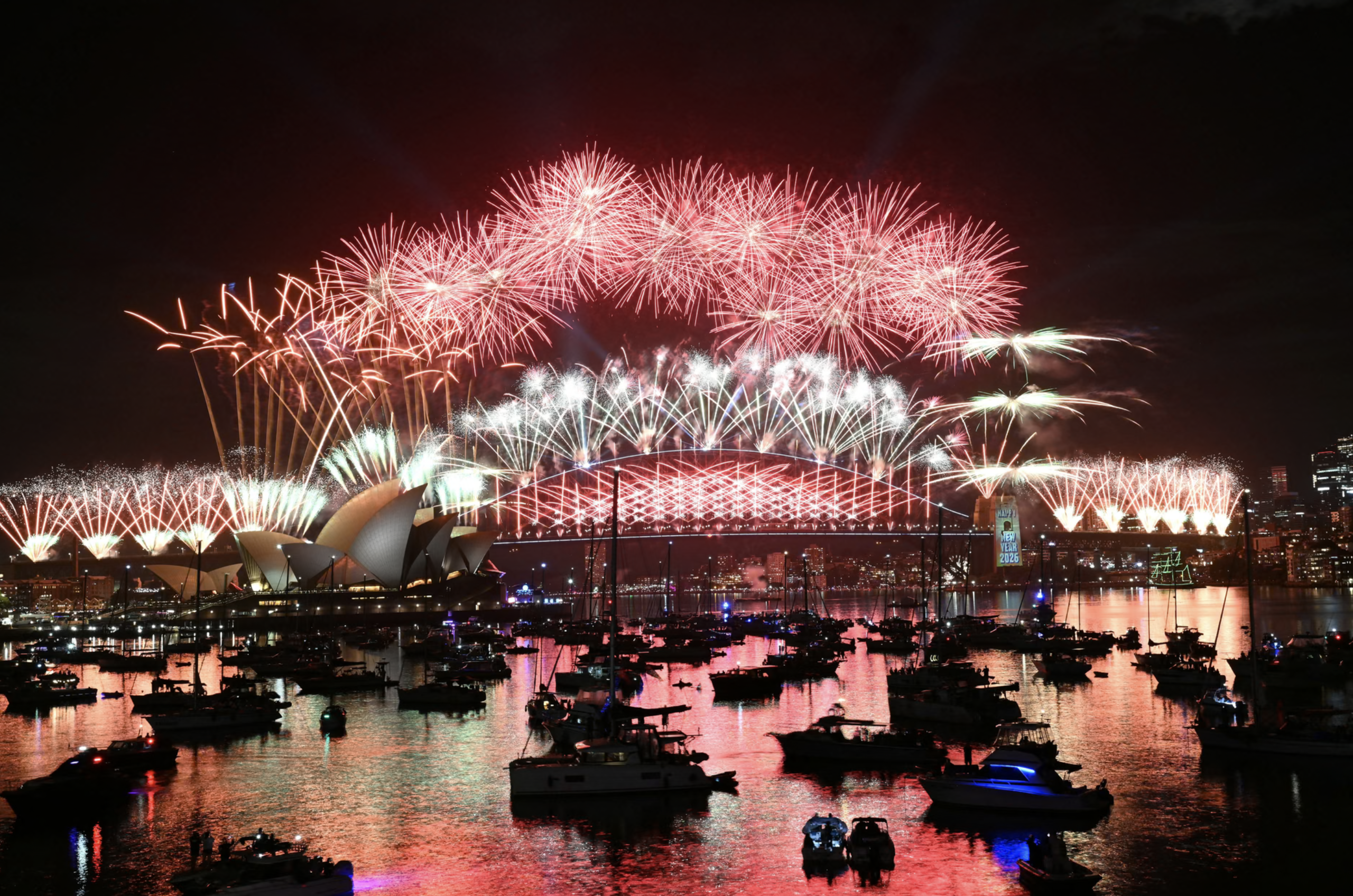 Pháo hoa được bắn lên từ Cầu cảng Sydney và Nhà hát Opera Sydney, trong khi rất đông người dân hân hoan trầm trồ theo dõi. Ảnh: Saeed Khan/AFP/Getty Images