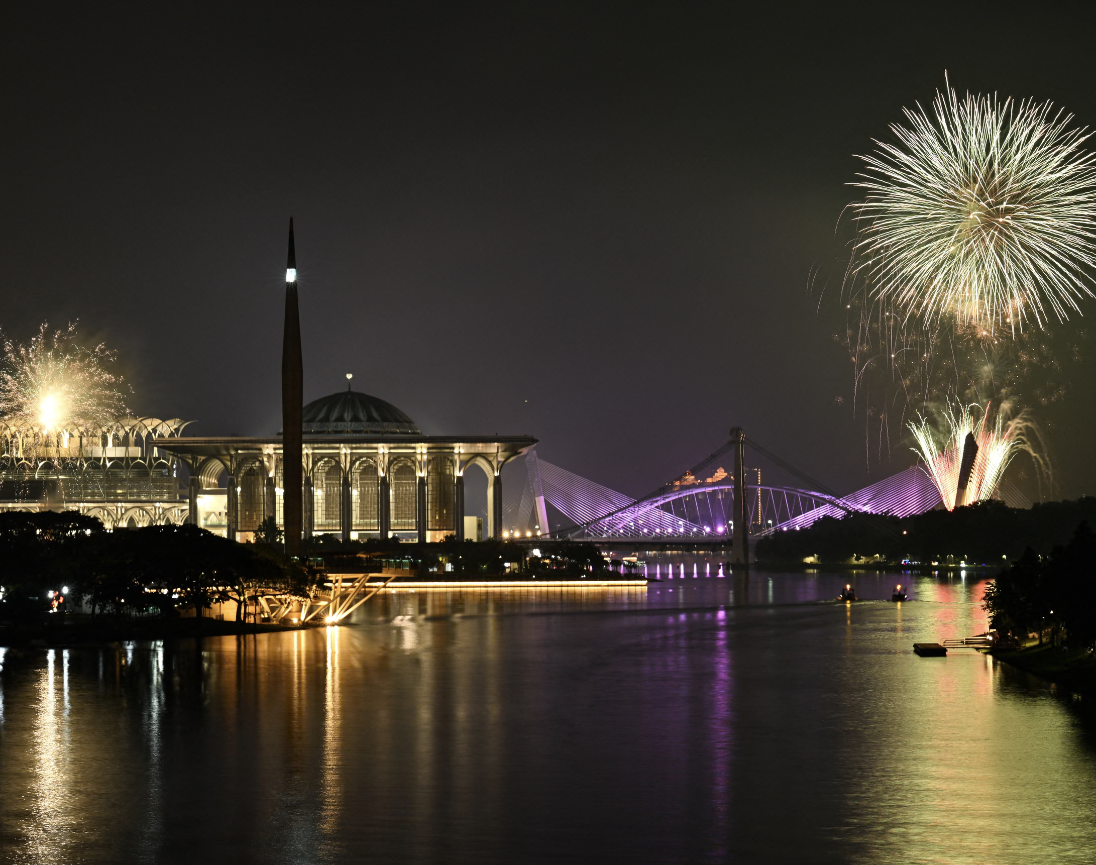 Pháo hoa rực sáng bầu trời đêm trên Nhà thờ Hồi giáo Tuanku Mizan Zainal Abidin và Cầu Seri Saujana trong lễ đón năm mới tại Putrajaya, Malaysia. Ảnh: Mohd Rasfan/AFP/Getty Images