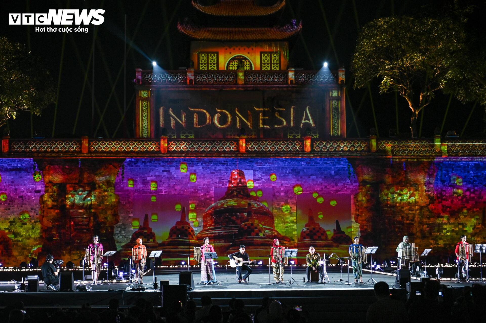 Đoàn nghệ thuật Indonesia mở màn cho chuỗi tiết mục quốc tế với bản nhạc "Hello Việt Nam" được thể hiện qua các nhạc cụ truyền thống.