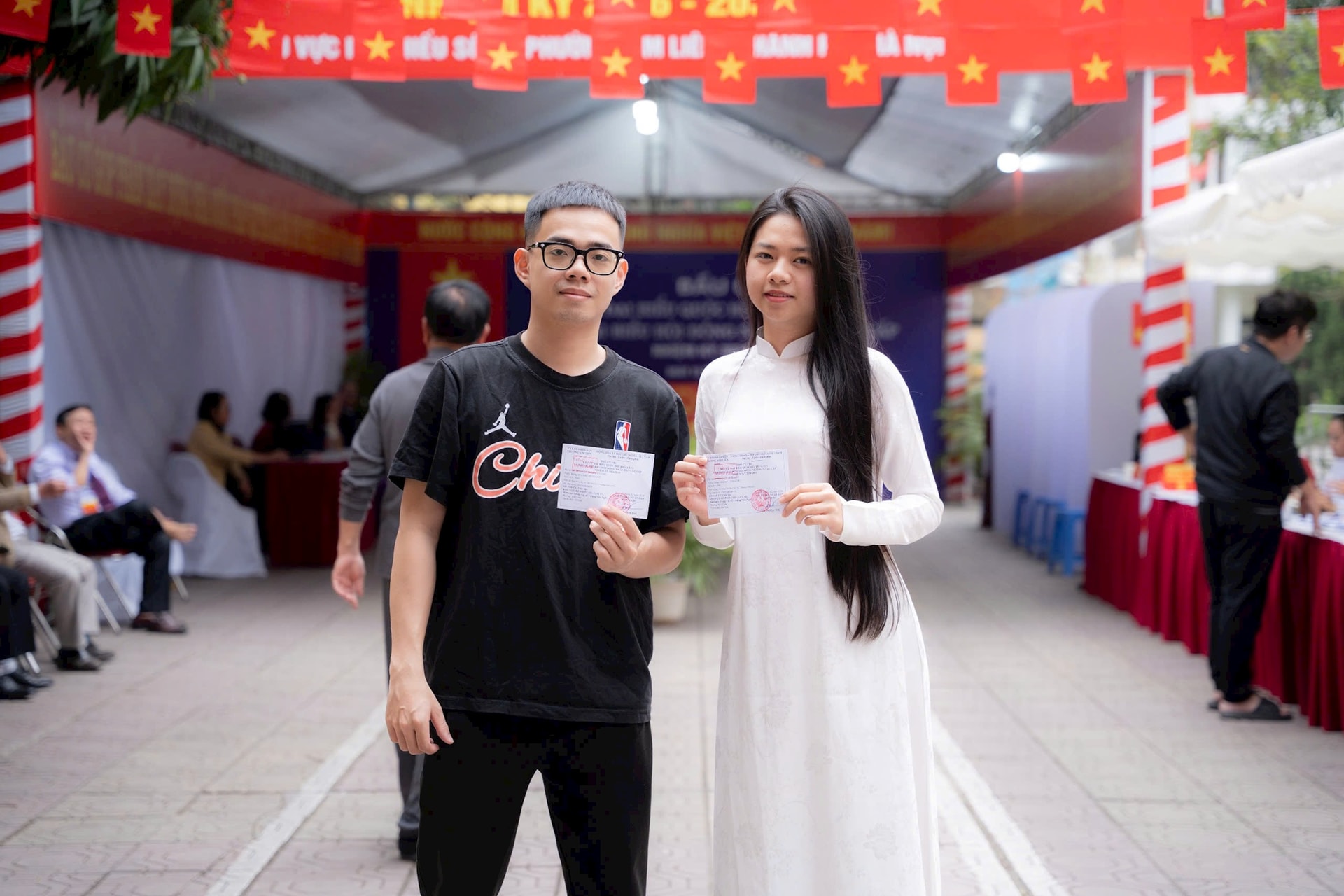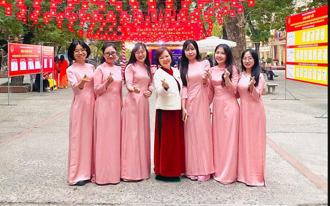 Giữa không gian rợp cờ đỏ sao vàng, những tà áo dài truyền thống tạo nên khung cảnh vừa trang trọng vừa tươi trẻ. Nhiều cử tri khi đến điểm bỏ phiếu đã dừng lại trò chuyện, chụp ảnh cùng các cô giáo.