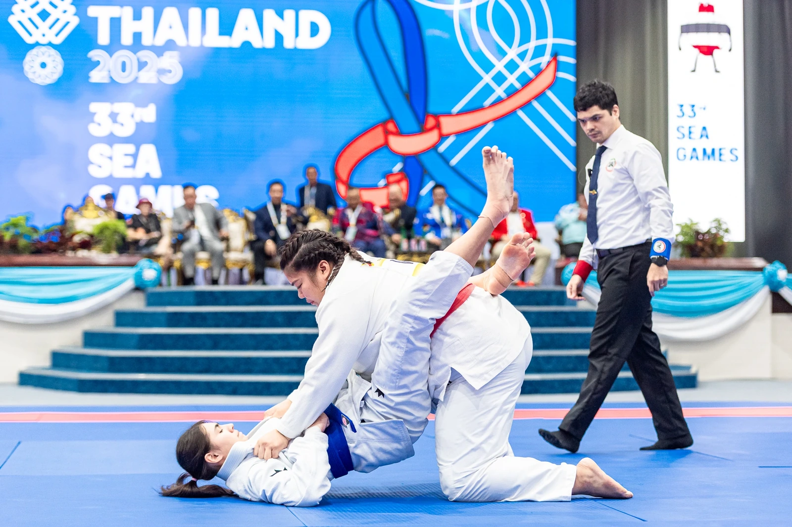 Ngày 13/12, Thanh Trúc và 15 đồng đội bước vào loạt trận nội dung đồng đội hỗn hợp. Tại bán kết, dù đội Jujitsu Việt Nam thắng áp đảo Philippines, Thanh Trúc vẫn là điểm sáng rực rỡ khi một mình “gánh” hai bài thi: Newaza Gi và Fighting.