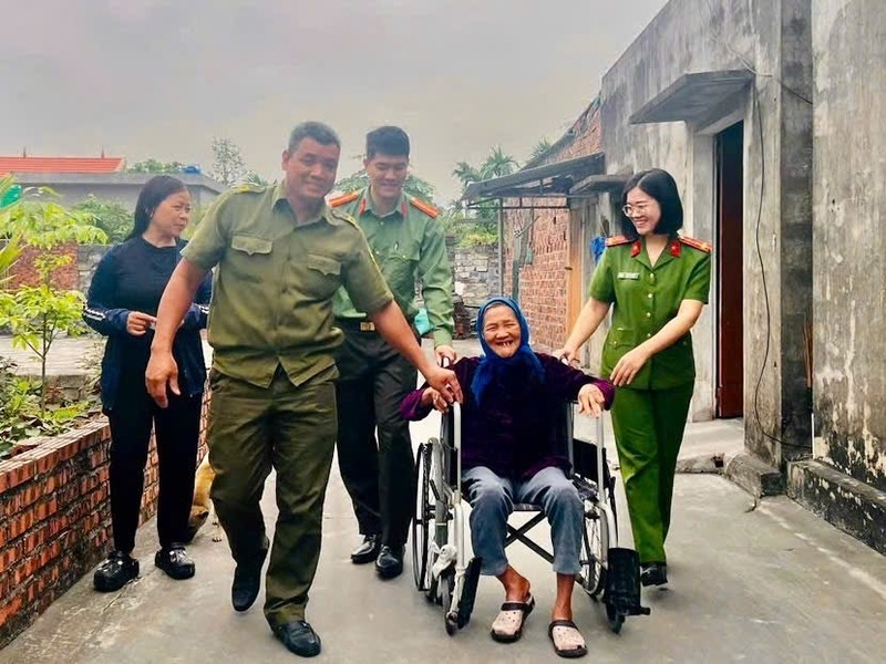Lực lượng chức năng hỗ trợ cử tri sức khỏe yếu thực hiện quyền và nghĩa vụ công dân. Ảnh: QN