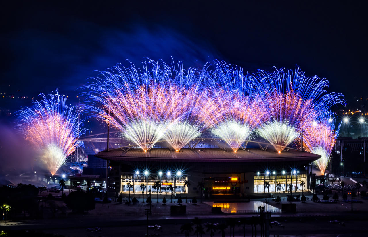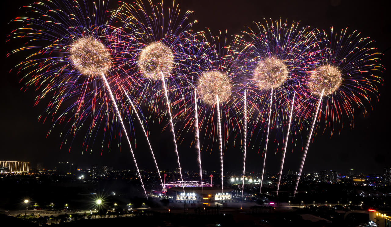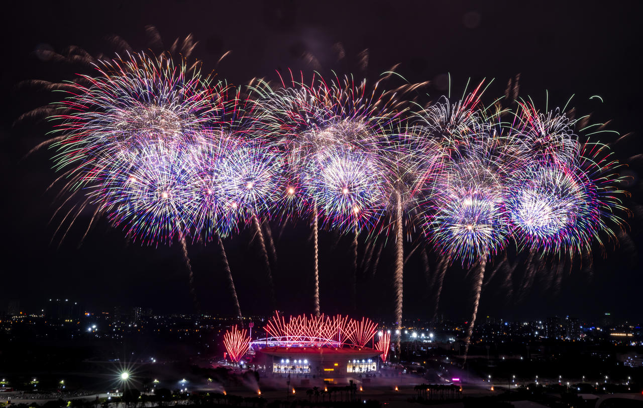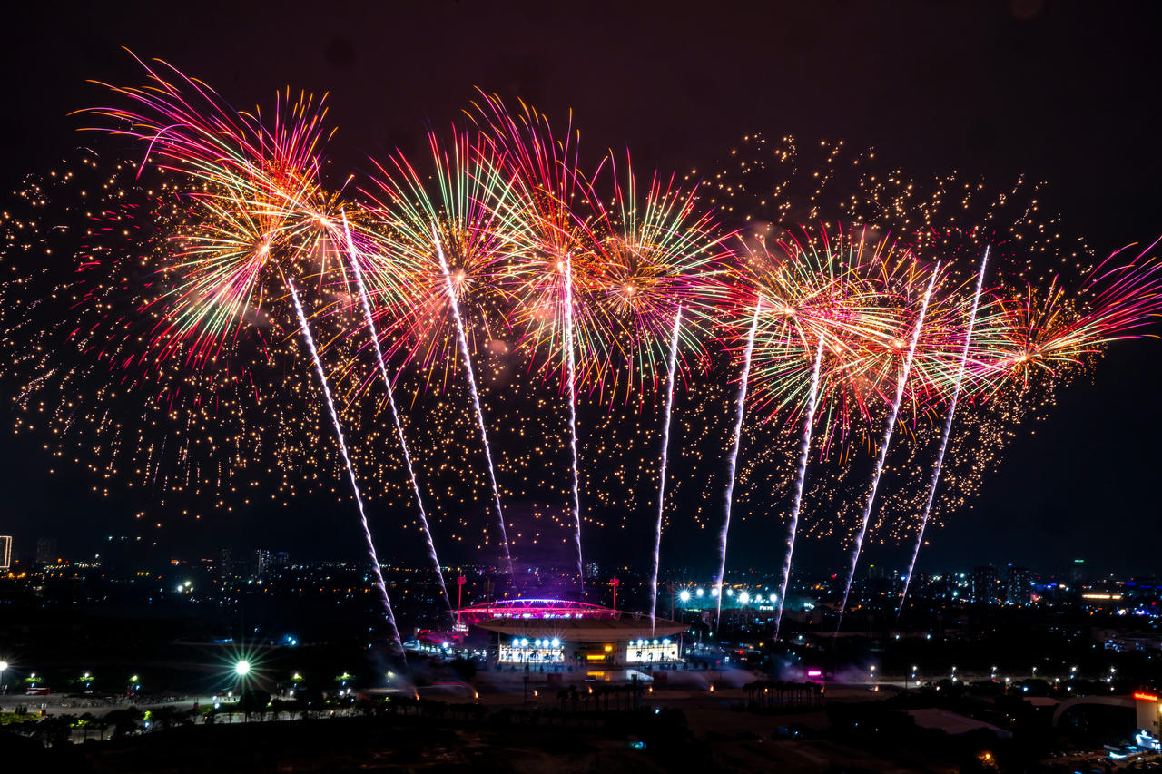 Ngay từ những loạt pháo đầu tiên, bầu trời Mỹ Đình đã rực sáng với các hiệu ứng màu sắc và ánh sáng đa lớp, nhanh chóng thu hút sự chú ý của người dân. Ở phần kết chương trình, pháo hoa nghệ thuật tầm cao liên tiếp bung nở, tạo nên những khoảnh khắc rực rỡ. Từ những hiệu ứng pháo lấp lánh sắc vàng, pháo chuyển nhanh sang bảy sắc cầu vồng với những tạo hình mới lạ, đưa khán giả vào dòng chảy cảm xúc.