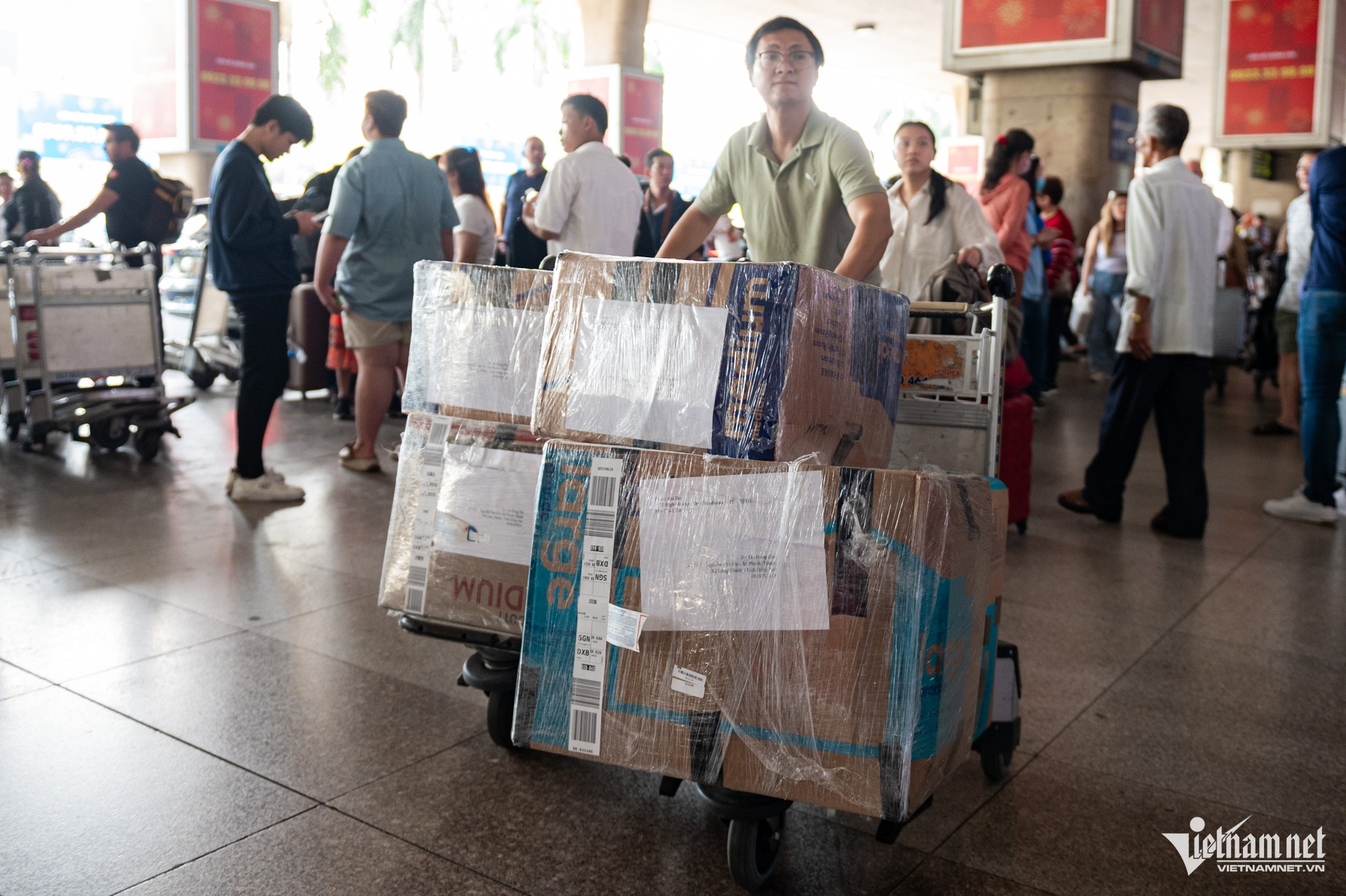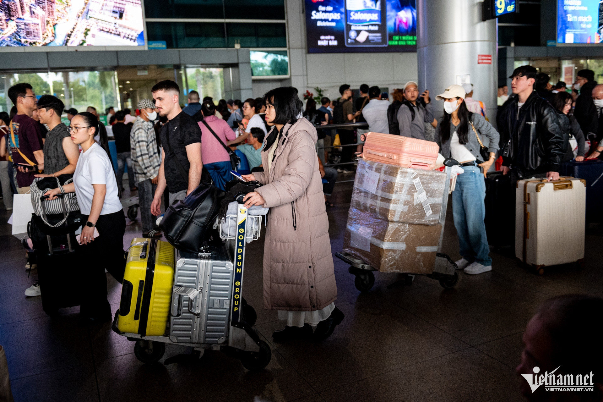 Chiều 10/2 (23 tháng Chạp), nhà ga quốc tế, sân bay Tân Sơn Nhất, TPHCM nhộn nhịp hơn thường lệ khi nhiều chuyến bay từ Mỹ, Canada, Australia, Hàn Quốc, Nhật Bản… chở nhiều bà con Việt kiều về quê ăn Tết liên tục hạ cánh.