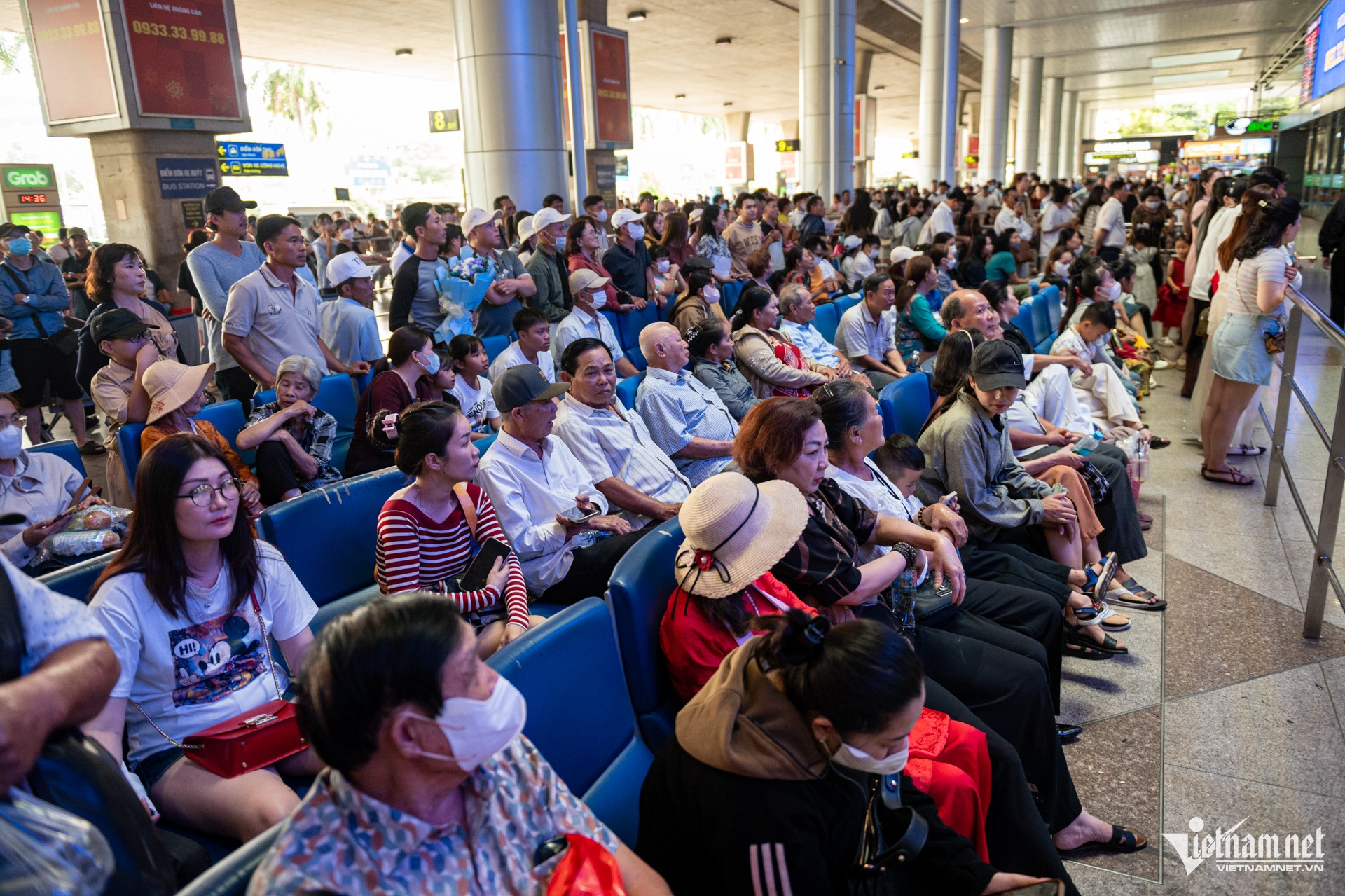 Tại sảnh đến, lượng người ngồi chờ để đón thân nhân tăng đột biến khiến các hàng ghế luôn kín chỗ.