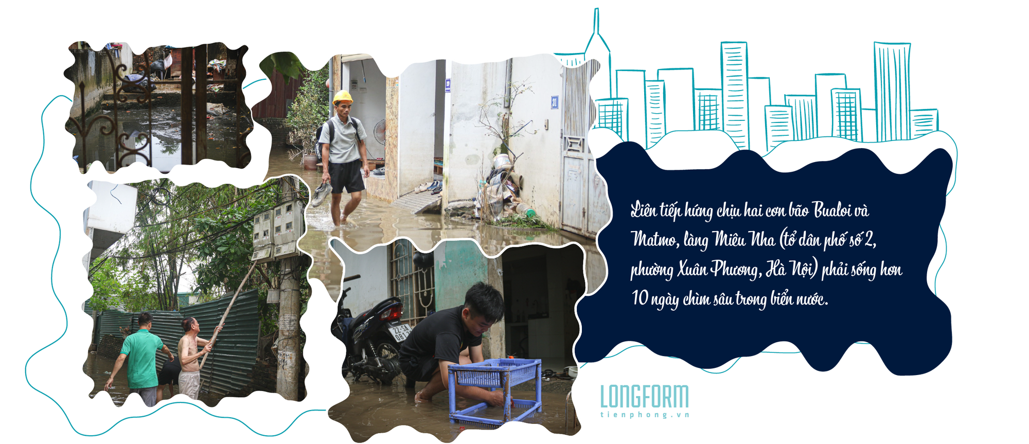 Tại tổ dân phố số 2 Miêu Nha (phường Xuân Phương), sau cơn bão số 10, 11, nước ngập suốt gần một tuần, có nơi sâu hơn 80 cm. Nhiều hộ phải di tản, mang theo trẻ nhỏ, vật dụng thiết yếu đến nhà người quen hoặc thuê nhà nghỉ tạm. “Chúng tôi sống như thời sơ tán. Nước ngập ngang ngực, nội thất nổi lềnh bềnh. Cả tuần nay chỉ ăn mì tôm sống, đi lại bằng thuyền phao,” ông Trần Tiến (phường Tây Mỗ, Hà Nội), chia sẻ.