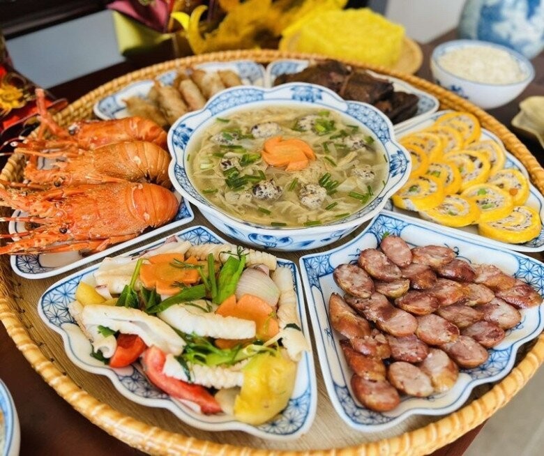 Mâm cỗ cúng ông Công ông Táo này gồm: Mực xào, lạp xưởng chiên, tôm hùm baby hấp, canh măng, trứng hấp vân, xôi, chim câu quay, nem tôm (Ảnh: Hồng Thúy).
