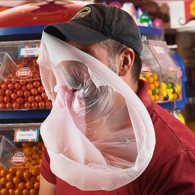 Chad Fell đã thổi quả bong bóng từ kẹo cao su to nhất thế giới với đường kính lên tới 50,8cm. Ông lập kỷ lục Guinness khi nhai 3 miếng kẹo cao su. Ảnh: Instagram/Guinnesswordrecords.