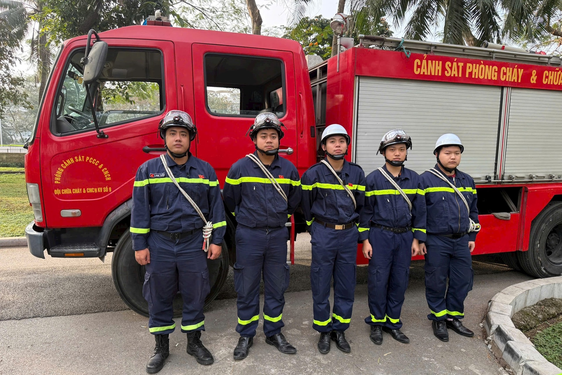 Cán bộ, chiến sĩ Đội Chữa cháy và cứu nạn, cứu hộ khu vực số 9 trực phòng cháy, chữa cháy trận địa pháo hoa tại Công viên Thống Nhất. Ảnh: VT