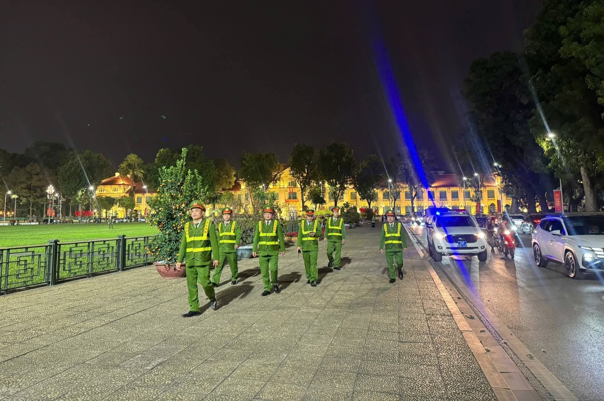 Công an phường Ba Đình tuần tra khu vực trọng điểm trong đêm giao thừa. Ảnh: VS