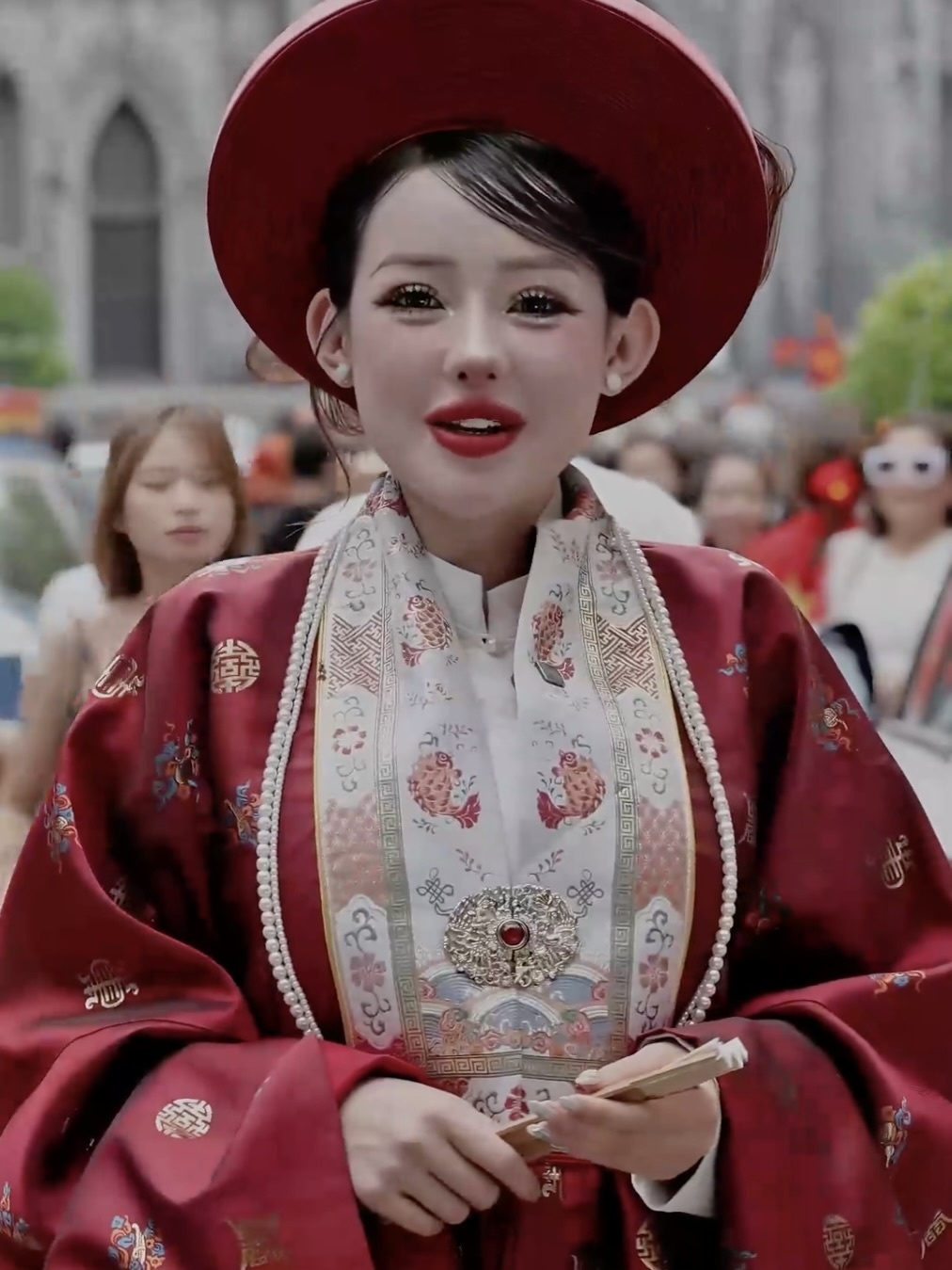 Trong clip, nữ DJ diện trang Việt phục màu đỏ, đầu đội mấn. Ngân 98 chia sẻ bản thân muốn quảng bá trang phục truyền thống của Việt Nam tại một điểm đến đặc trưng tại Hà Nội.
