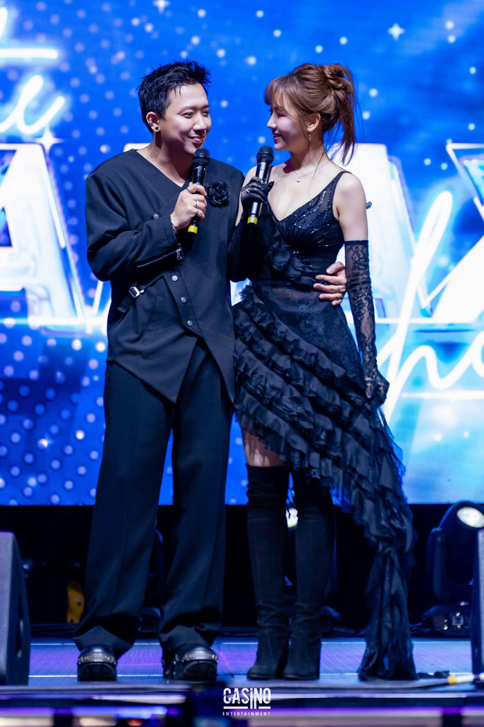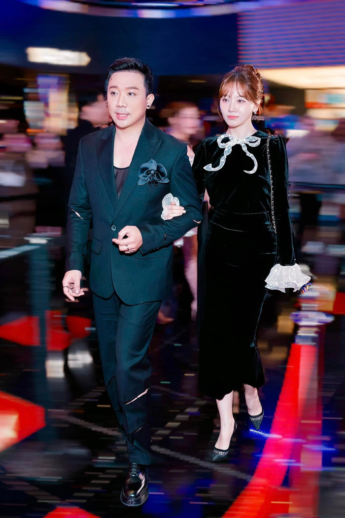 Màu đen luôn là lựa chọn hàng đầu đôi vợ chồng. Trong lần xuất hiện gần đây, Trấn Thành chọn vest đen lịch lãm với chi tiết hoa cài áo độc đáo. Hari Won sang trọng với chiếc váy nhung đen dài tay, tạo điểm nhấn bằng chiếc nơ lớn màu trắng ở cổ, mang lại vẻ ngoài cổ điển và quý phái. Ảnh: FBNV