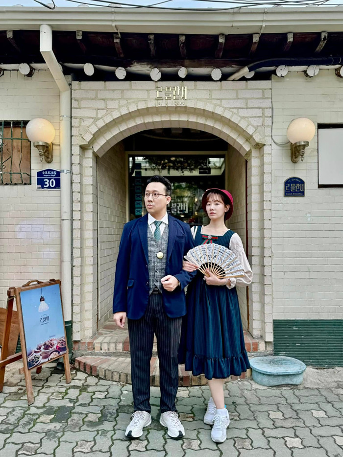 Cặp đôi còn thử nghiệm phong cách vintage với các món đồ mang tông màu xanh navy và họa tiết sọc đứng. Trấn Thành lịch lãm với áo vest và gile, còn Hari Won dịu dàng với váy vintage và mũ nồi, tạo nên sự đồng điệu về chủ đề và thời đại. Ảnh: FBNV