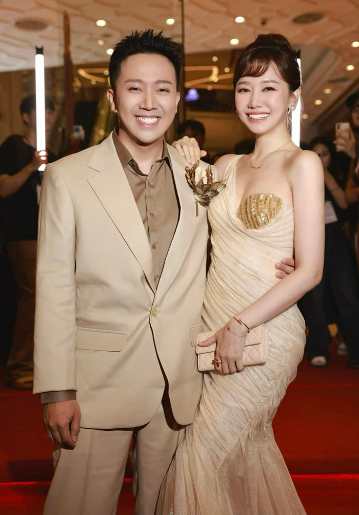 Ở một phong cách khác, Trấn Thành chọn vest tông be kết hợp áo sơ mi nâu đất, tạo nên một tổng thể ấm áp và thời thượng. Hari Won diện chiếc váy bó sát màu nude ánh kim, với chi tiết vỏ sò vàng nổi bật ở ngực, tạo nên một tổng thể tone sur tone hoàn hảo. Ảnh: FBNV