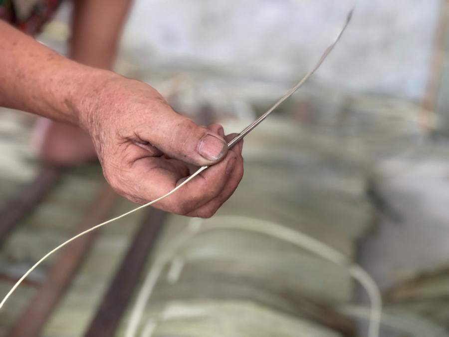 Để chằm áo tơi, người dân sử dụng một loại kim có dài khoảng 20cm để xỏ dây mây luồn qua từng lớp lá.