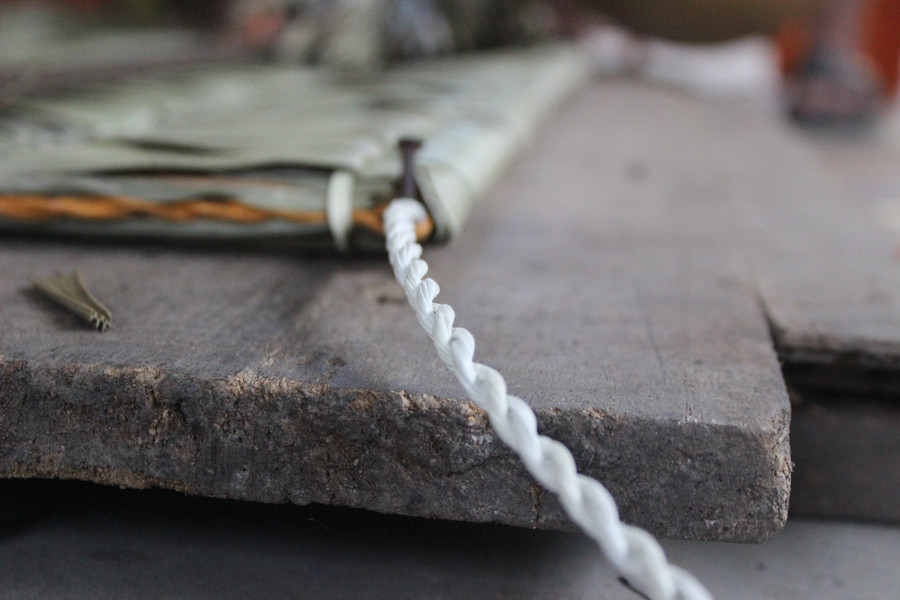 Theo người dân, hiện nay dây mây được thay thế bằng các dây nhựa mỏng. Loại dây này giúp người dân tiện lợi khi chằm áo nhưng độ bền đẹp không hề thua kém dây mây,