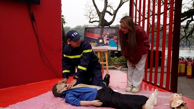 Thiếu tá Nguyễn Đức Thắng, Phó trưởng phòng Cảnh sát PCCC&CNCH, Công an TP Hà Nội, chia sẻ: “Chúng tôi đã mang đến đây các khí tài và dụng cụ, trang thiết bị hiện đại nhất để phục vụ công tác chữa cháy và cứu nạn, cứu hộ. Ngoài ra, chúng tôi có một gian riêng để tuyên truyền về an toàn phòng cháy trong khu dân cư, giúp người dân hiểu rõ các biện pháp phòng ngừa cũng như cách thoát nạn; hướng dẫn trực tiếp các kỹ năng cơ bản như sơ cấp cứu, hô hấp nhân tạo, sử dụng bình chữa cháy, và cách dập tắt đám cháy ngay khi phát sinh. Những biện pháp này là thiết thực nhất, gần gũi nhất với đời sống của người dân”.
