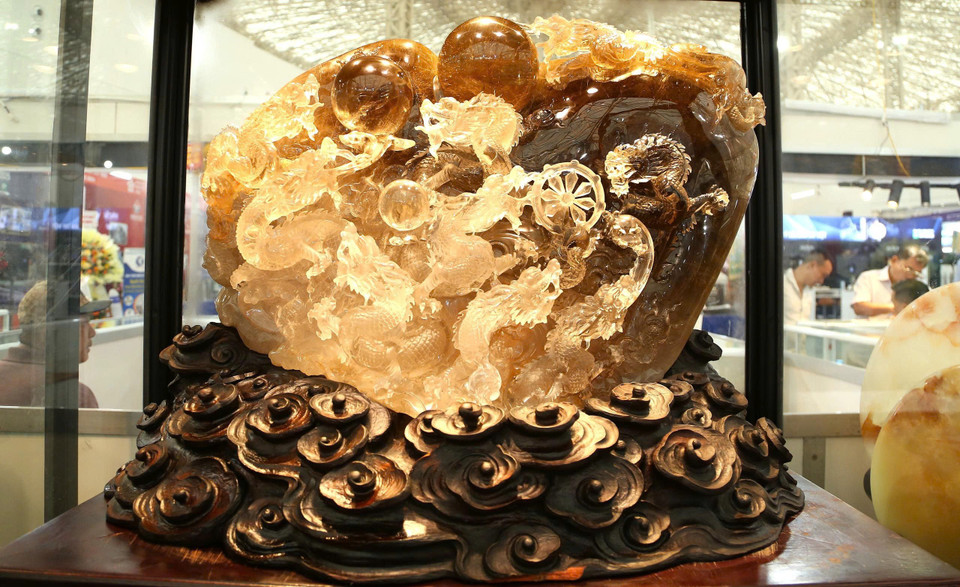 Hội chợ Mùa Thu là sự kiện xúc tiến thương mại có quy mô lớn nhất được tổ chức trong năm nay. Các doanh nghiệp tham gia sự kiện cũng mang đến những sản phẩm nổi bật, trong đó tác phẩm đá quý có tên "Cửu long tranh châu" có giá 10 tỷ đồng, chất liệu đá thạch anh tóc vàng Brazil, đế đỡ bằng gỗ hoàng đàn đen có giá trị hàng trăm triệu đồng. (Ảnh: PV/Vietnam+)