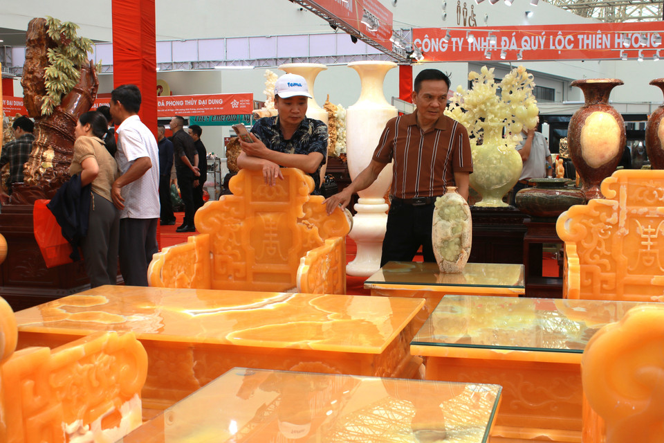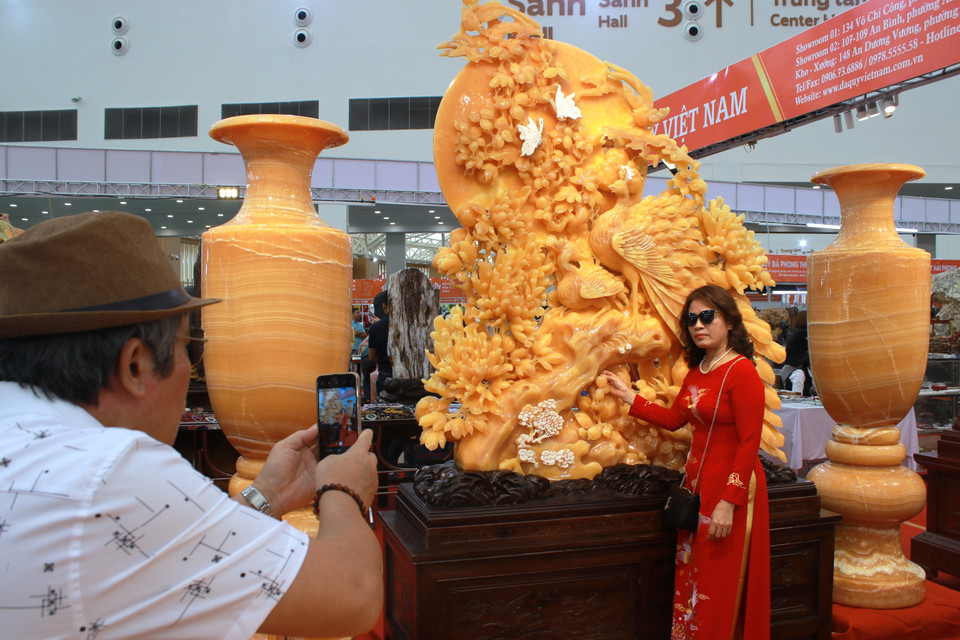Chất liệu lõi đồng phủ vàng, ngọc từ đá phong thủy được nhiều người quan tâm chiêm ngưỡng, chụp ảnh lưu niệm tại hội chợ. (Ảnh: Minh Anh/Vietnam+)
