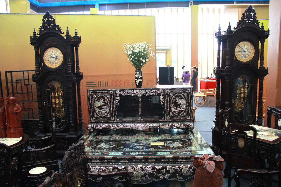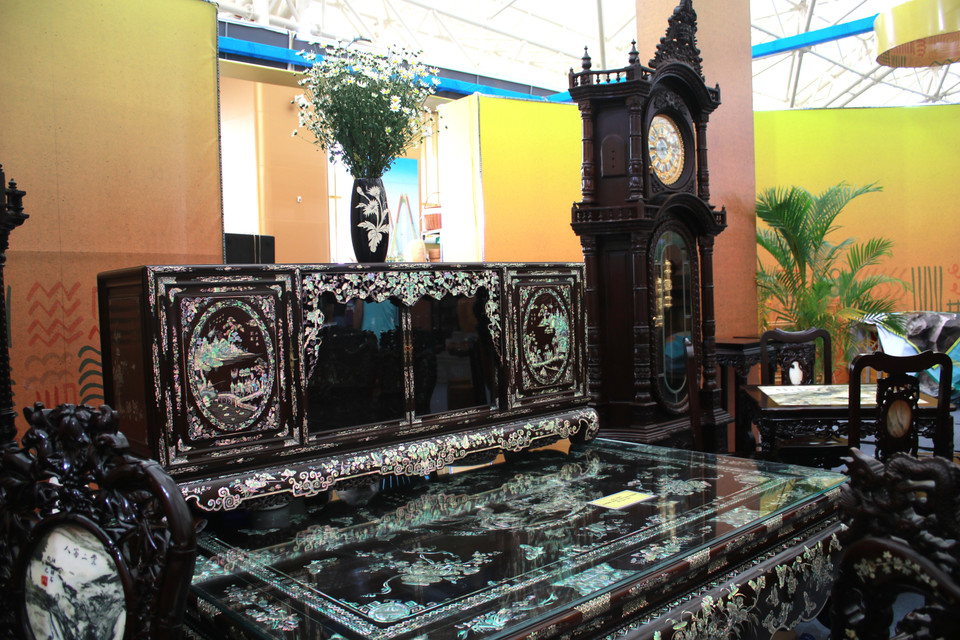 Bộ sập gụ tủ chè có giá 650 triệu đồng từ chất liệu gỗ gụ mật Quảng Bình - hiện đang là loại hiếm và khảm trai ốc Singapore - loại trai ốc sở hữu ánh bảy sắc cầu vòng đẹp mắt. (Ảnh: Minh Anh/Vietnam+)