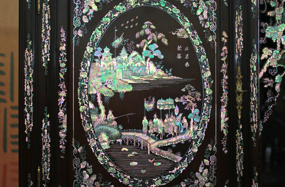 Theo chủ cửa hàng đồ Thủ công mỹ nghệ Lâm Tới, bộ sập và tủ được khảm xen lọng với 8kg vỏ trai ốc nhập khẩu. (Ảnh: Minh Anh/Vietnam+)