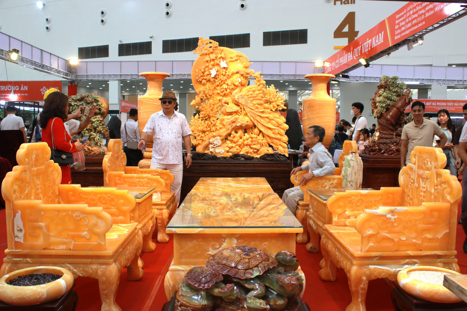 Cùng khu vực có bộ bàn ghế đá màu vàng rực rỡ, có giá 3,5 tỷ đồng, thuộc Công ty Đá quý Lộc Chinh. (Ảnh: Minh Anh/Vietnam+)