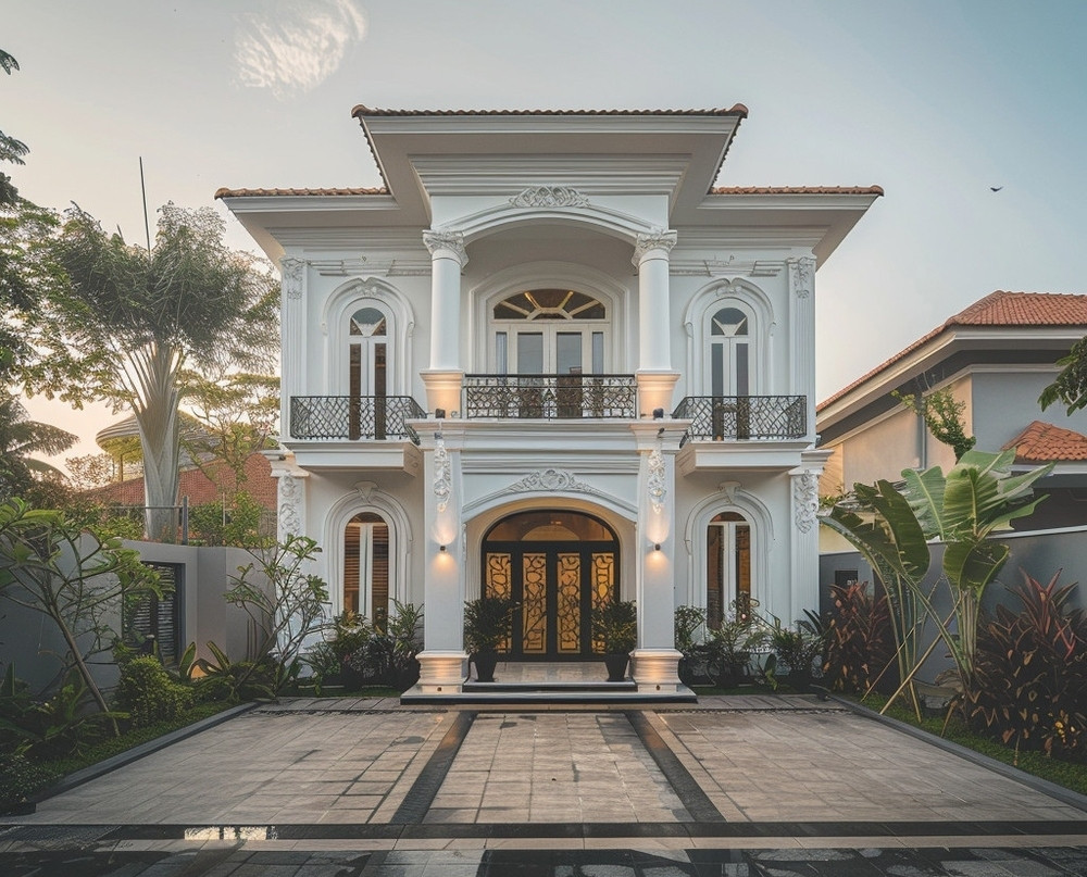 Năm 2026, mẫu nhà 2 tầng tân cổ điển tiếp tục khẳng định sức hút nhờ vẻ đẹp sang trọng, tinh tế nhưng không quá cầu kỳ. Thiết kế tập trung khai thác các chi tiết phào chỉ nhẹ, cột trụ đơn giản và màu sắc trang nhã như trắng, kem, be.