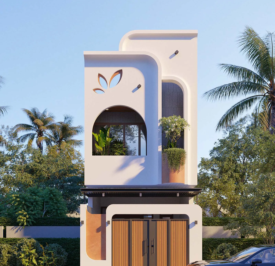 Mẫu nhà mái bằng 100m² 2 tầng sở hữu những đường nét bo cong mềm mại kết hợp các chi tiết lá cây cách điệu làm điểm nhấn. Tầng 1 là không gian sinh hoạt chung, còn tầng 2 bố trí 3 phòng ngủ.