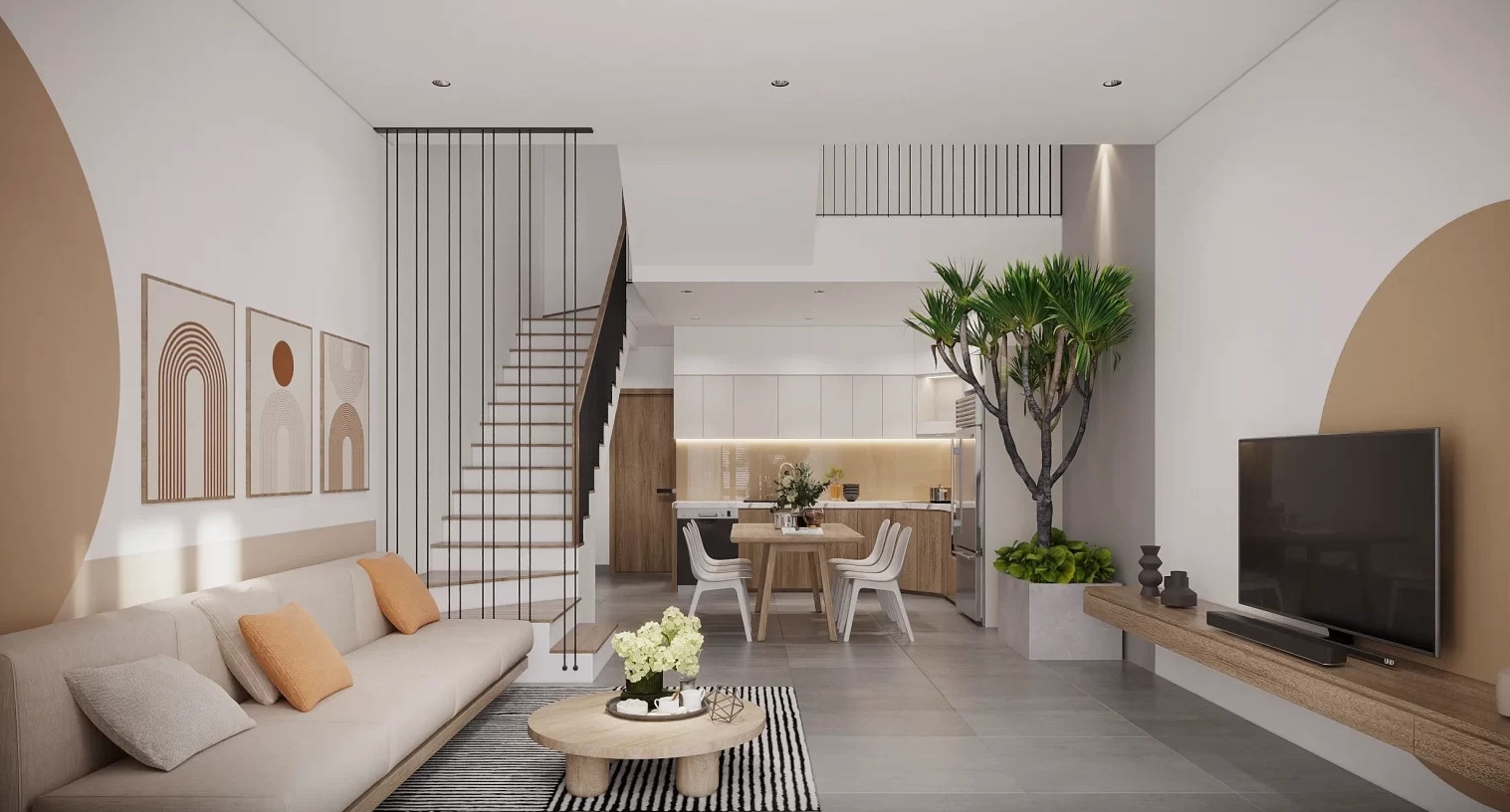 Đây là lựa chọn phổ biến cho nhà ống. Nội thất thường sử dụng đường nét gọn gàng, màu sắc trung tính như trắng, be, xám kết hợp gỗ sáng màu. Khu vực phòng khách và bếp được phân tách ước lệ bằng thảm, sofa hoặc hệ đèn trần, vừa tinh tế vừa hiệu quả.