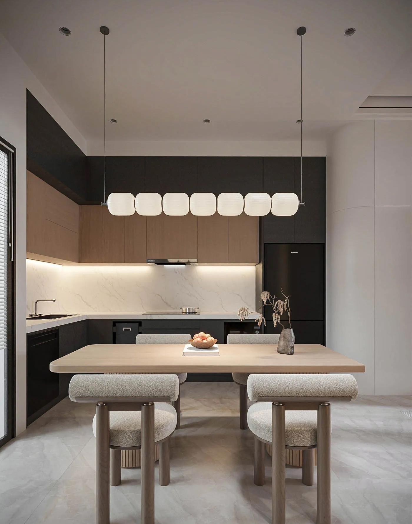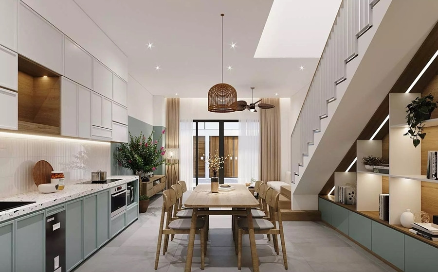 Phong cách này giúp căn bếp trông rộng hơn, đồng thời làm nổi bật những món đồ trang trí như đèn thả, kệ gỗ hoặc cây xanh.