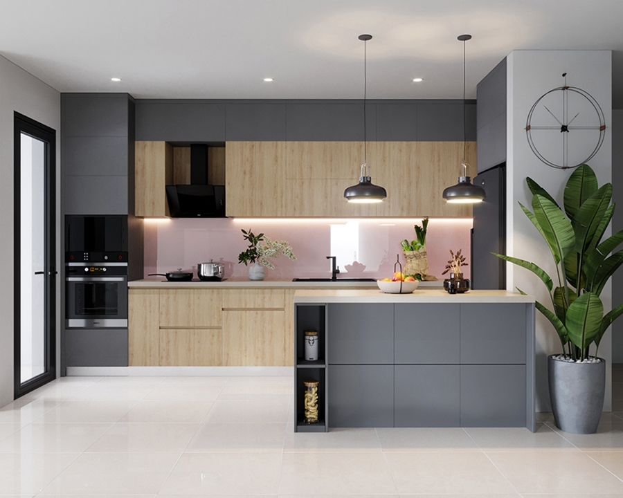 Với những không gian rộng rãi, tủ bếp chữ I có thể kết hợp thêm bàn đảo hoặc quầy bar để tăng thêm diện tích sử dụng.