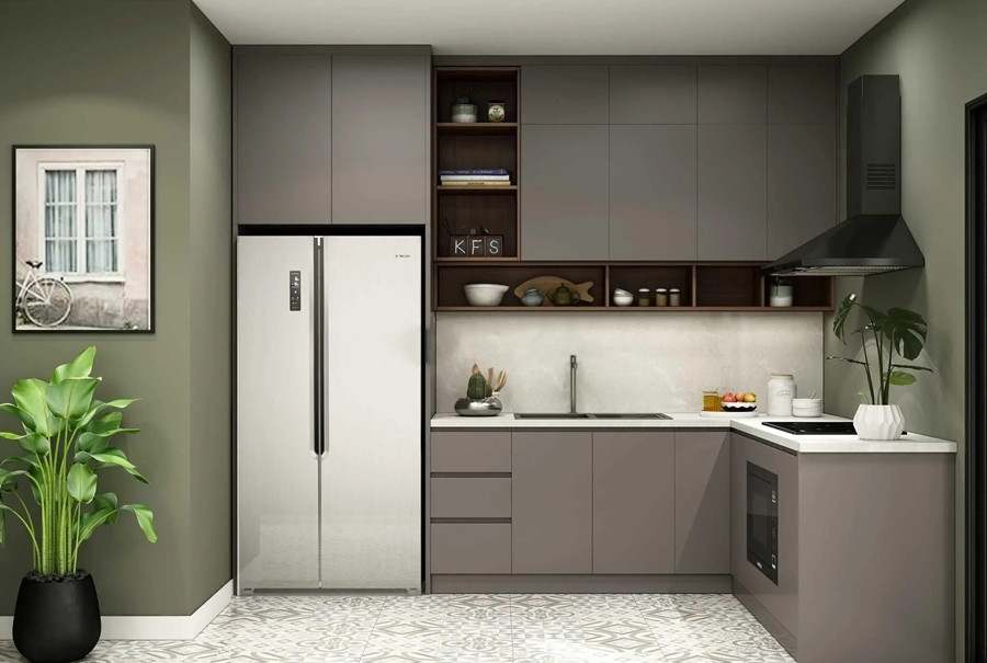 Hiện nay, xu hướng tủ bếp chữ L thường kết hợp kịch trần, tận dụng tối đa không gian và tăng sự sang trọng.