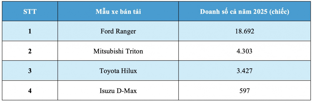 Mẫu xe bán tải còn lại trong nhóm cũng ghi nhận doanh số tăng nhẹ: Isuzu D-Max đạt khoảng 597 xe cả năm, tuy con số không lớn nhưng vẫn phản ánh nhu cầu ổn định đối với dòng bán tải cỡ nhỏ nhập khẩu.