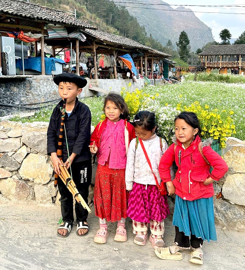 Các nghệ sĩ nhí thổi khèn chào đón khách du lịch.