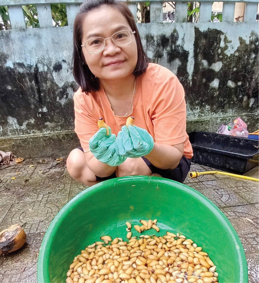 “Nuôi đuông dừa rất đơn giản, không tốn nhiều công sức, rảnh khi nào chăm sóc khi đó. Con giống được đặt trong chậu nhựa có nắp đậy và đục lỗ để thông khí. Sau đó bỏ xơ dừa, các loại trái cây vào làm thức ăn, thỉnh thoảng có thể “dặm” thêm cám gạo, cám bắp theo tỷ lệ phù hợp. Sau 10 ngày thì tách con mẹ ra để sinh sản tiếp lứa mới. Chu kỳ từ lúc đuông dừa bắt đầu sinh sản đến khi được thu hoạch con non bán thương phẩm khoảng từ 40 - 45 ngày. Sau 3 lần sinh sản thì thay lứa giống mới và khi đó, có thể lựa chọn con khỏe nhất để làm giống cho lứa tiếp theo”, chị Chanh cho hay.