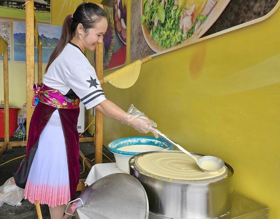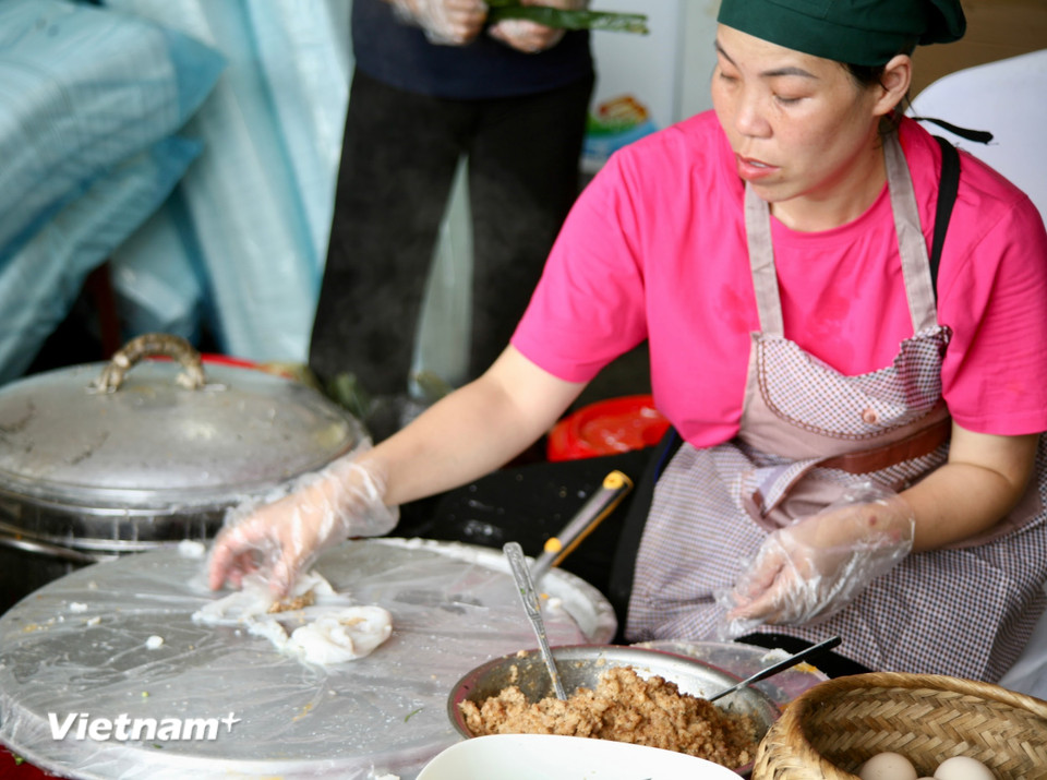 Gian hàng bánh cuốn Cao Bằng được tráng liên tục không ngơi tay để kịp phục vụ thực khách. (Ảnh: Trịnh Huyền/Vietnam+)