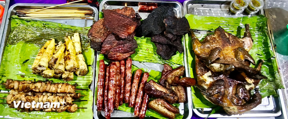 Thịt trâu gác bếp, gà nướng mắc khén - đặc sản tại gian hàng Điện Biên. (Ảnh: Trịnh Huyền/Vietnam+)