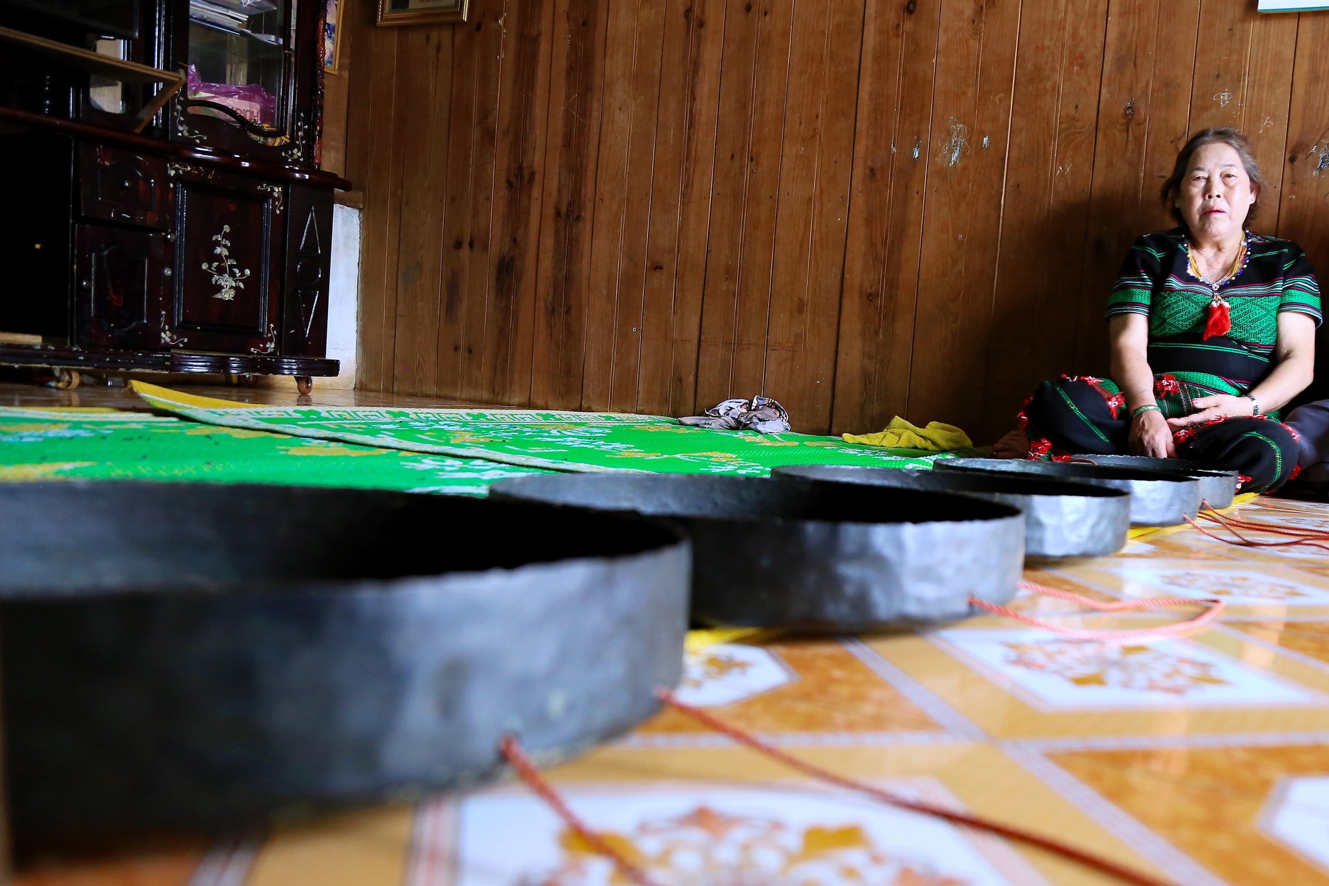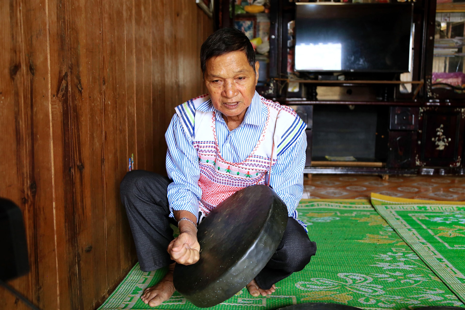 Nghệ nhân H'Grao bên dàn chiêng của người Mạ