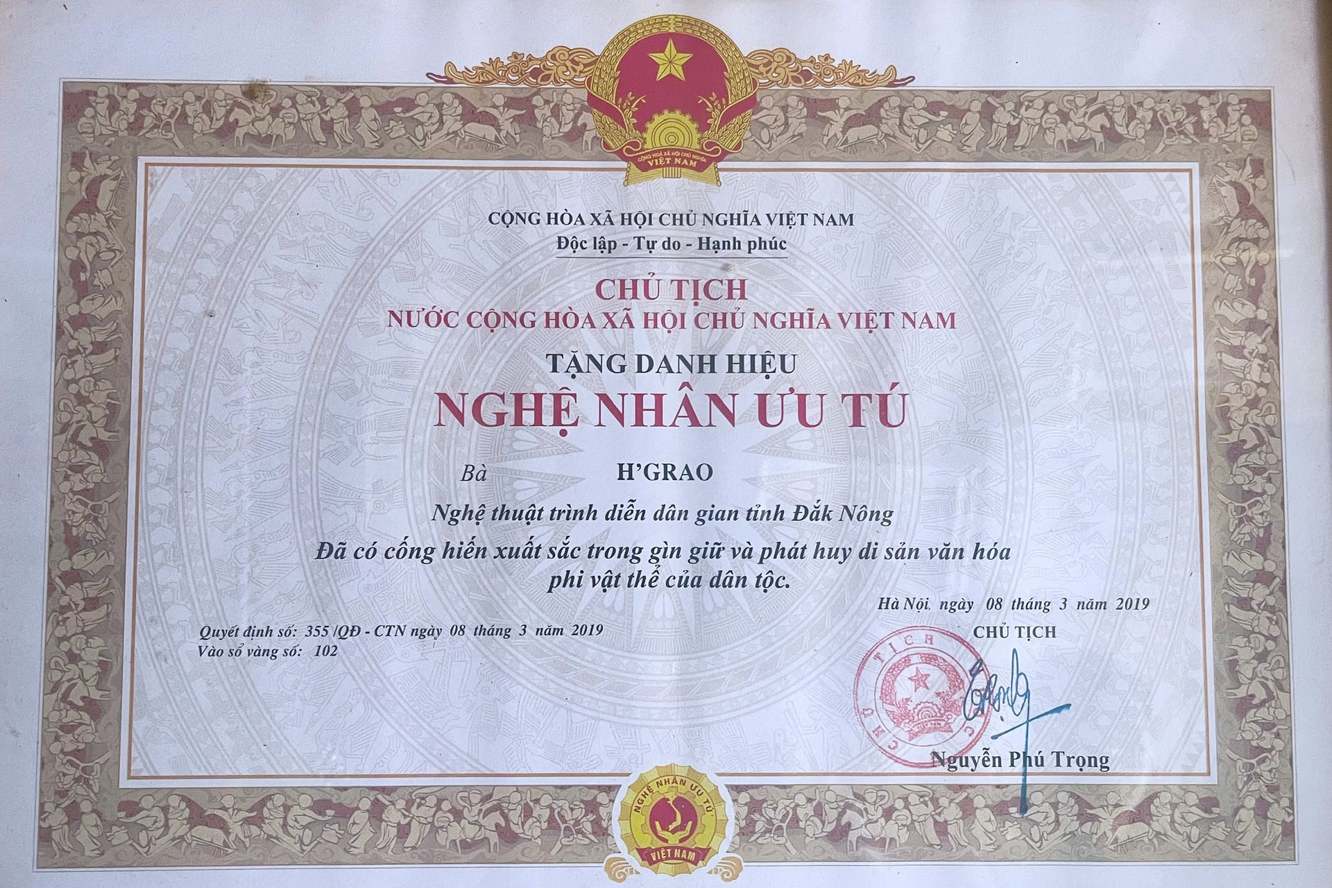 Đặc biệt, năm 2019, bà H’Grao vinh dự được Chủ tịch nước phong tặng danh hiệu “Nghệ nhân ưu tú” vì những đóng góp xuất sắc trong việc bảo tồn và phát huy nghệ thuật trình diễn dân gian của dân tộc Mạ. Đó không chỉ là niềm tự hào của riêng bà, mà còn là minh chứng cho sức sống bền bỉ của những âm điệu truyền thống giữa đời sống hôm nay.