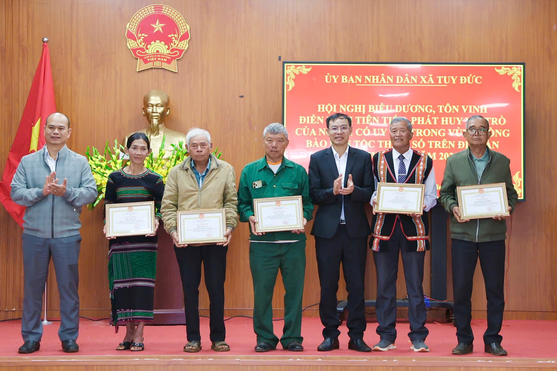 Nghệ nhân Thị Ai (thứ 2 từ trái sang) được địa phương tôn vinh, biểu dương điển hình tiên tiến trong cộng đồng. Ảnh: Nguyễn Nam