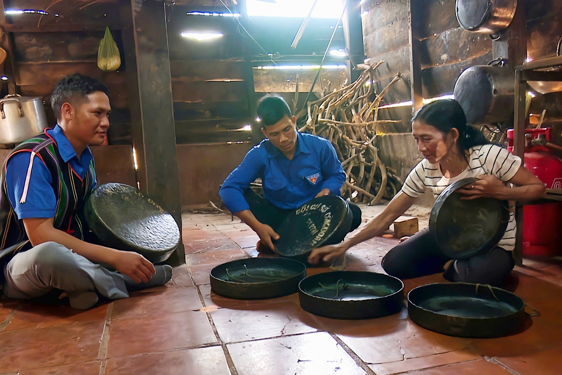 Nghệ nhân Thị Ai truyền dạy biểu diễn cồng chiêng cho đoàn viên thanh niên địa phương